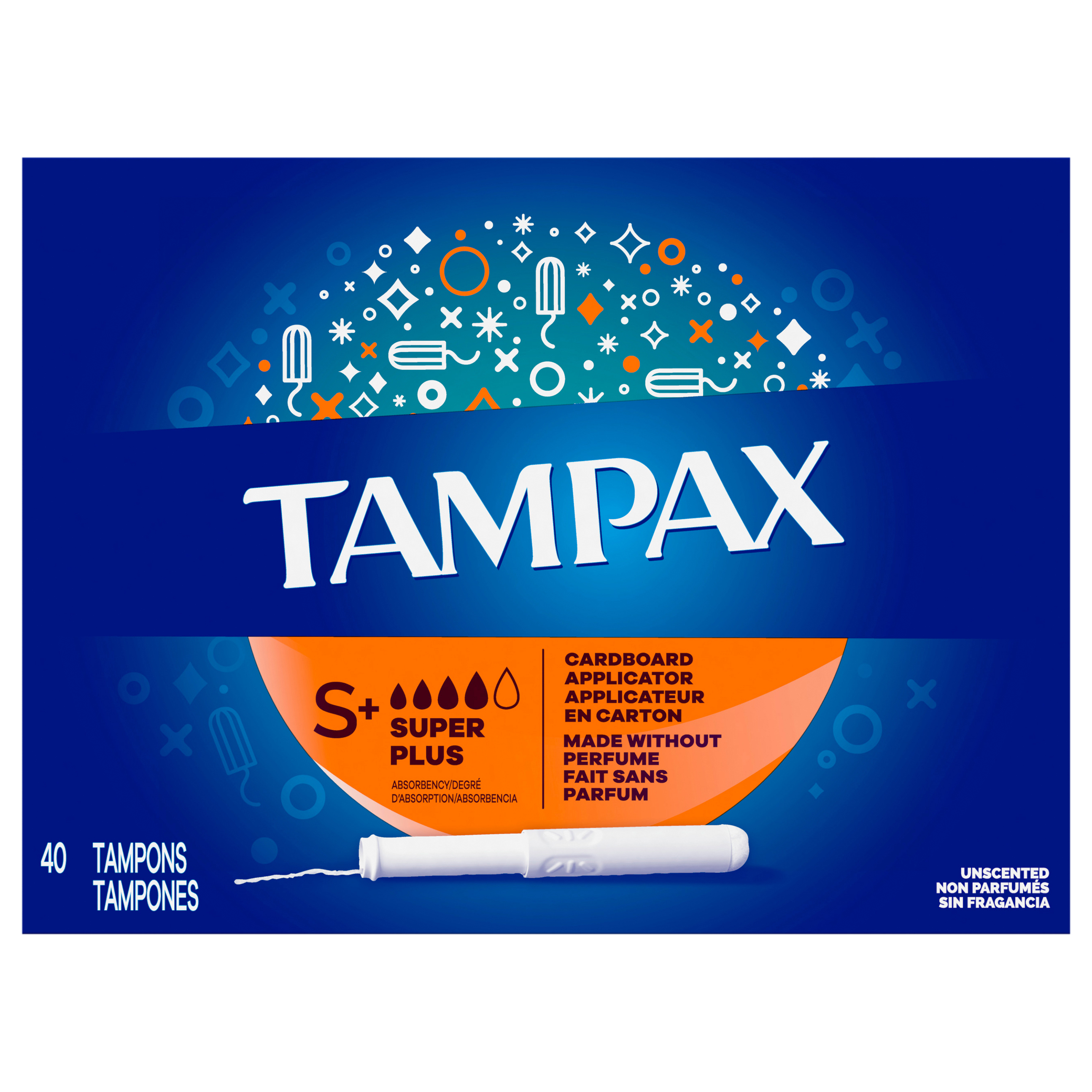 Super plus. Absorbency. Cardboard applicator. Made without perfume. Unscented. #1 U.S. gynecologist recommended tampon brand (a). Clinically tested gentle to skin. (a) Based on a 2024 survey. Tampax Guarantee: 1-800-398-3766. Satisfaction guaranteed, or your money back. If not satisfied with the performance of Tampax, send original receipt and UPC within 60 days of purchase for a refund via a prepaid card in the amount of your purchase. Limited to one redemption per name, address or household; no organizations. Call 1-800-398-3766 for more information. tampax.com. www.pg.com. how2recycle.info. Tampax: Scan me. Learn more about your product and its ingredients tampax.com. Questions? 1-800-523-0014. Made in USA with domestic and imported materials.