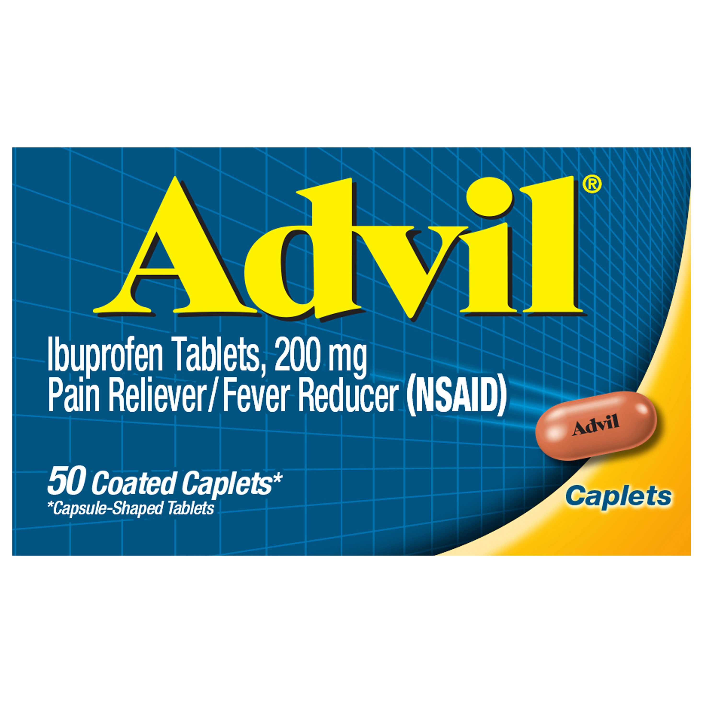 Ibuprofen tablets, 200 mg pain reliever/ fever reducer (NSAID). 50 coated caplets (Capsule-shaped tablets). www.Advil.com. Question or comments? call toll free 1-800-88-Advil. For most recent product information, visit www.Advil.com.