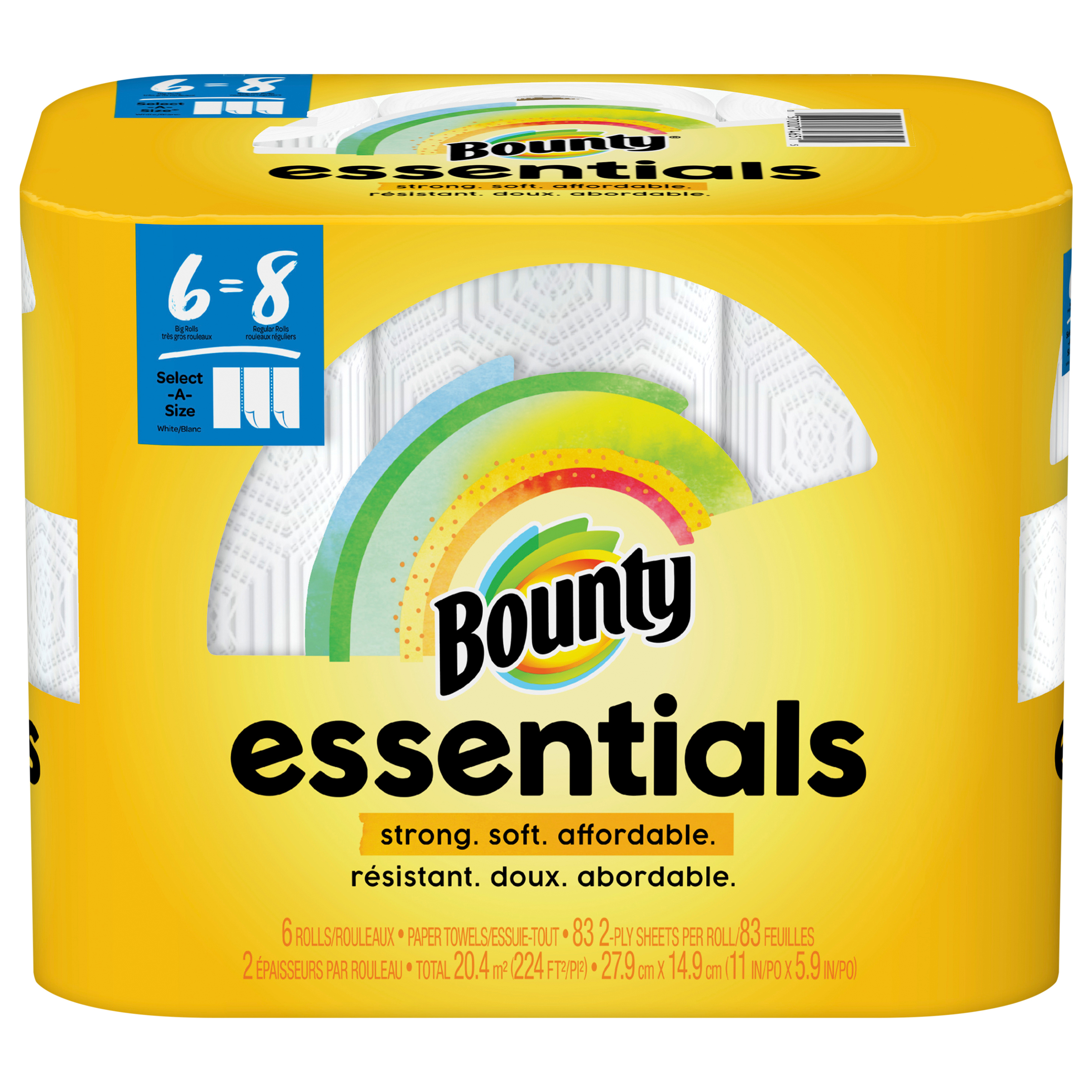 Total 20.4 m sq (224 ft sq). 27.9 cm x 14.9 cm (11 in x 5.9 in). 6 big rolls = 8 regular rolls. Select -A- Size. White/blanc. Strong. Soft. Affordable. Meal time messes just got easier. www.BountyTowels.com. www.pg.com. how2recycle.info. Scan to discover more! Questions? Comments? Call 1-800-9-BOUNTY. www.BountyTowels.com. Meal time messes just got easier - try Bounty napkins! Made in the USA from domestic and imported materials.