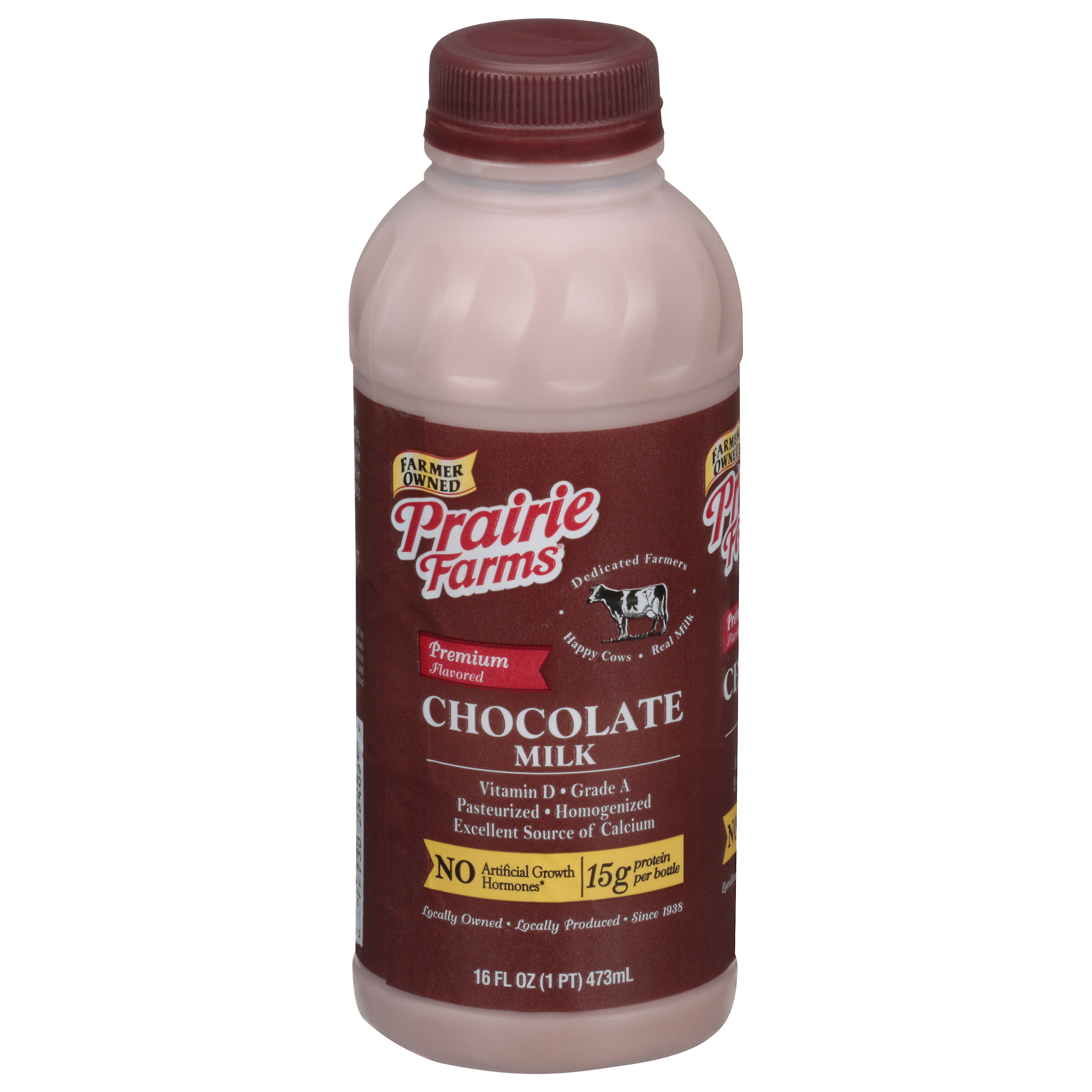 Premium flavored. 15 g protein per bottle. Vitamin D. Excellent source of calcium. Farmer owned. Dedicated farmers. Happy cows. Real milk. Pasteurized. Homogenized. No artificial growth hormones (The FDA has determined that no significant difference has been shown between milk derived from artificial growth hormone treated and non-artificial growth hormone treated cows). Locally owned. Locally produced. Since 1938. Processed at location stamped on container. Grade A. prairiefarms.com.