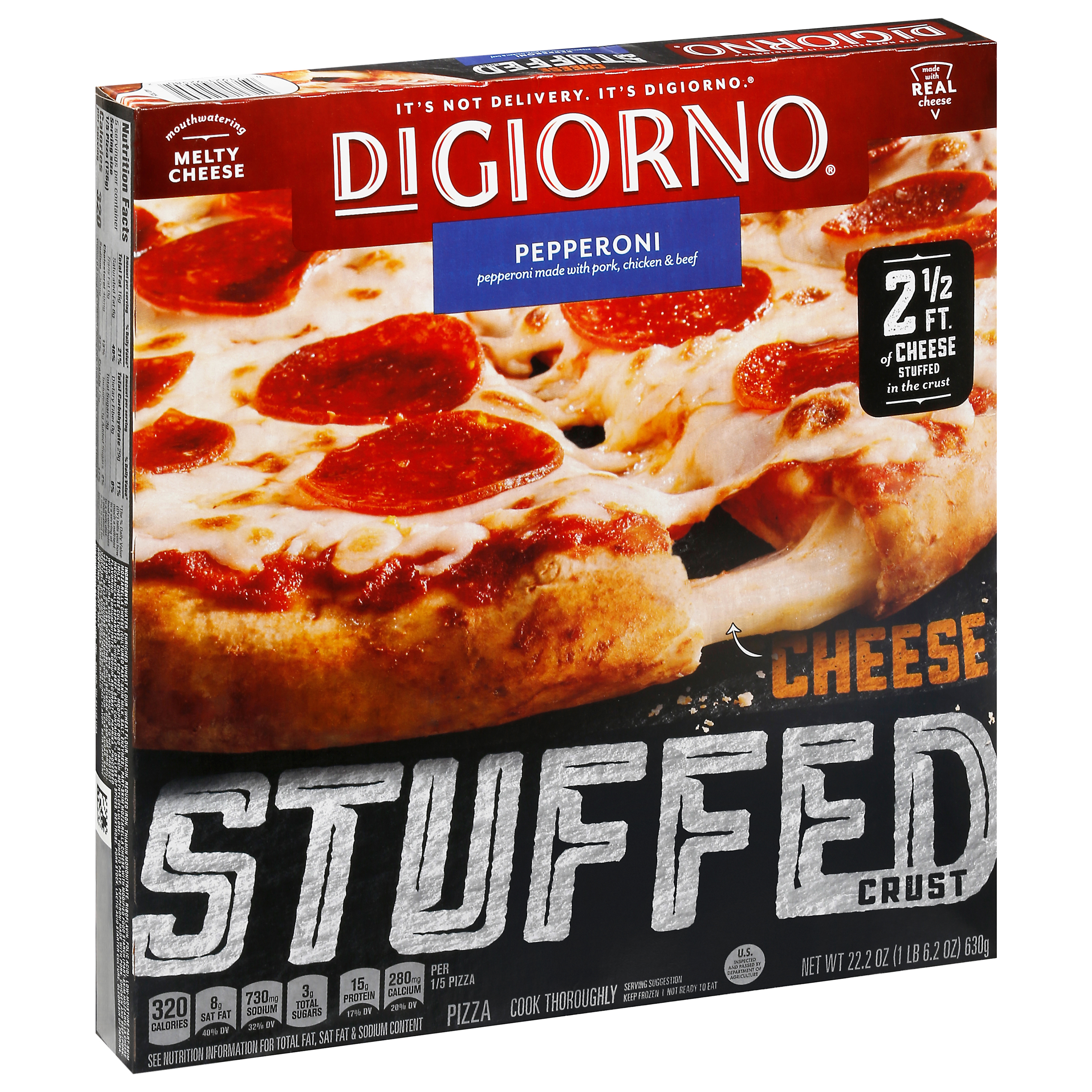 Pepperoni made with pork, chicken & beef. Per 1/5 Pizza: 320 calories; 8 g sat fat (40% DV); 730 mg sodium (32% DV); 3 g total sugars; 15 g protein (17% DV); 280 mg calcium (20% DV). See nutrition information for total fat, sat fat & sodium content. Nutritional Compass: Nestle - Good food, good life. Thoughtful Portion: Enjoy a portion of Digiorno cheese stuffed crust pizza with a fresh green salad and great company 1 portion = 1/5 pizza. Good to Connect: Text or call us at 1-800-708-5580 or visit digiorno.com. Please have package available! Mouthwatering melty cheese. It's not delivery. it's Digiorno. 2-1/2 ft. of cheese stuffed in the crust. Not ready to eat. digiorno.com. how2recycle.info. Instagram: Post your picture perfect pizza & tag (at)digiorno.
